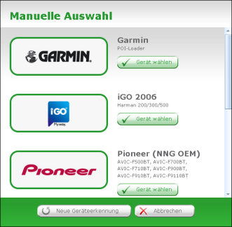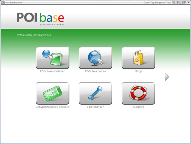 Vor dem Programmstart sollte man zuerst das Navigationsgerät mit dem Rechner verbinden. Anschließend die POIbase-Software starten und ggf. manuell das eigene Navi in POIbase auswählen (falls es nicht automatisch erkannt wird).